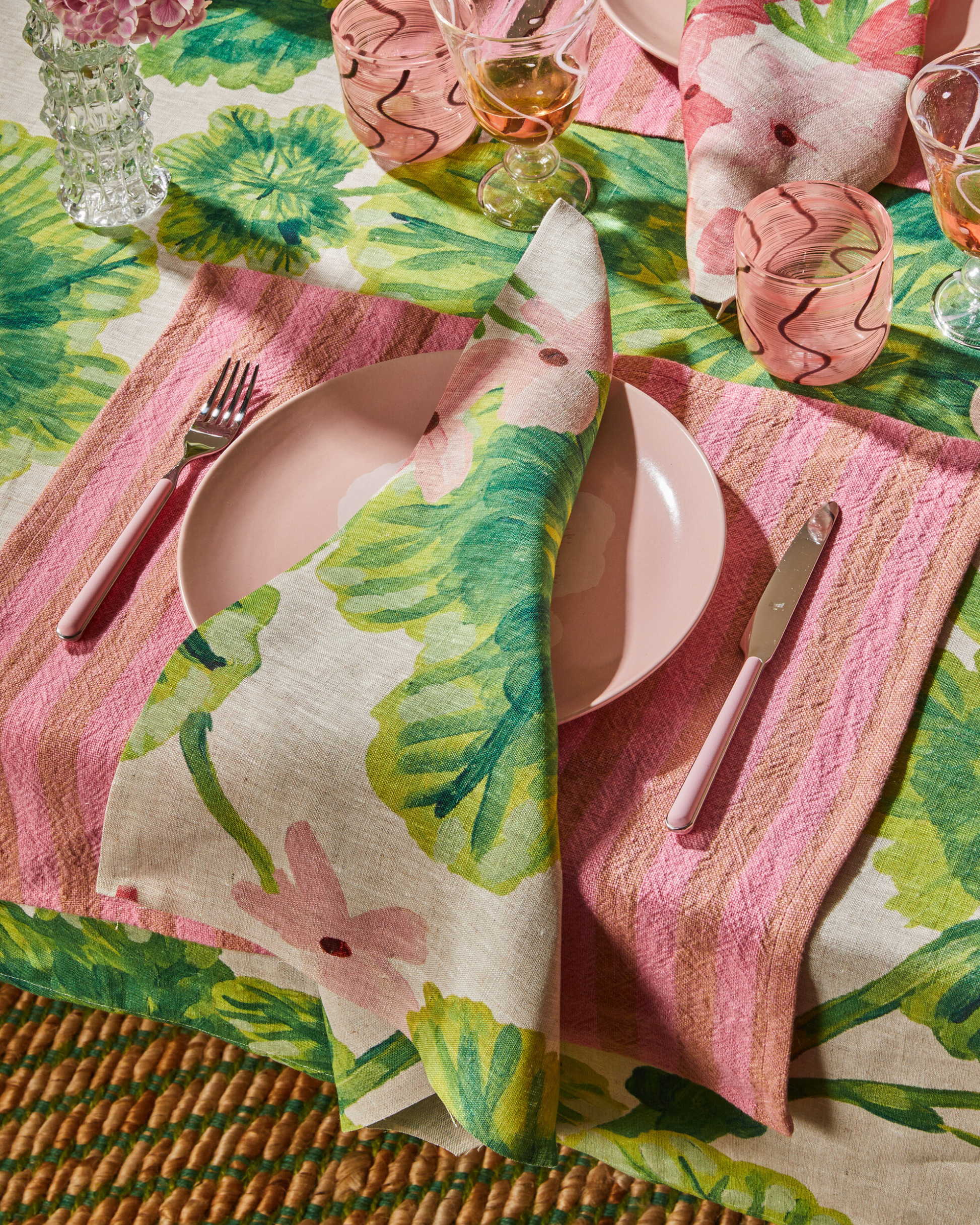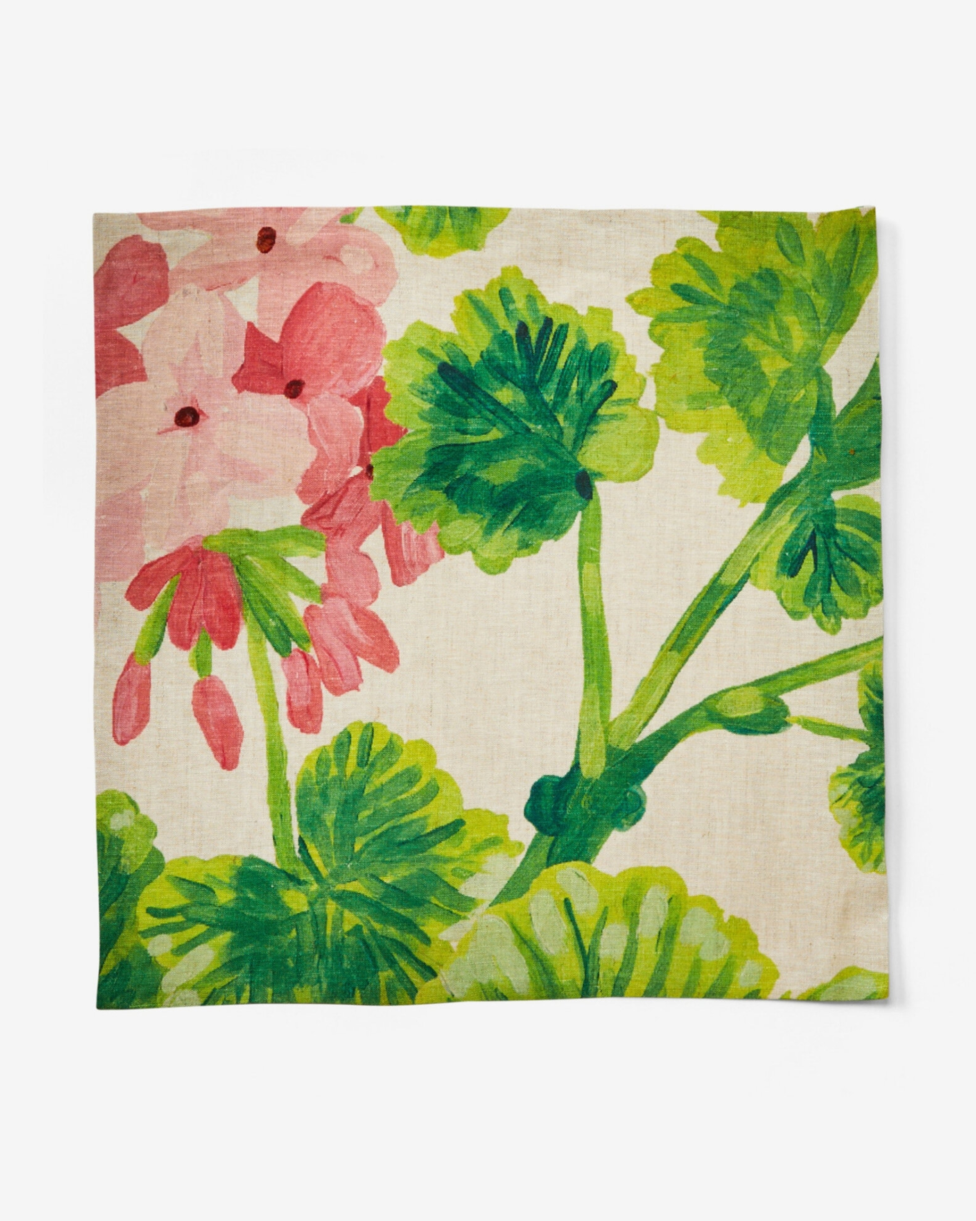 Painterly geraniums in vivid, pink and green bring an overgrown garden feel to these linen napkins.
