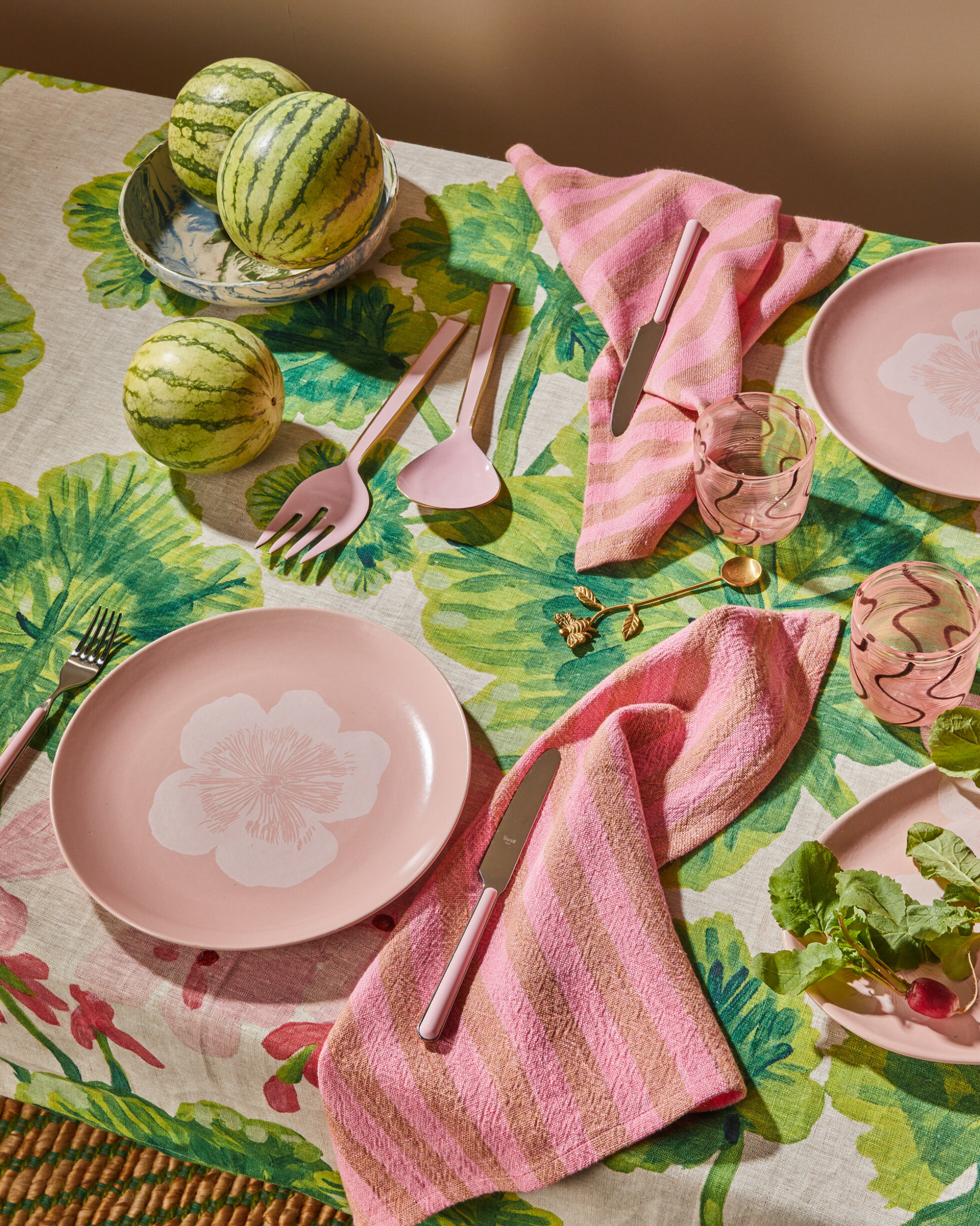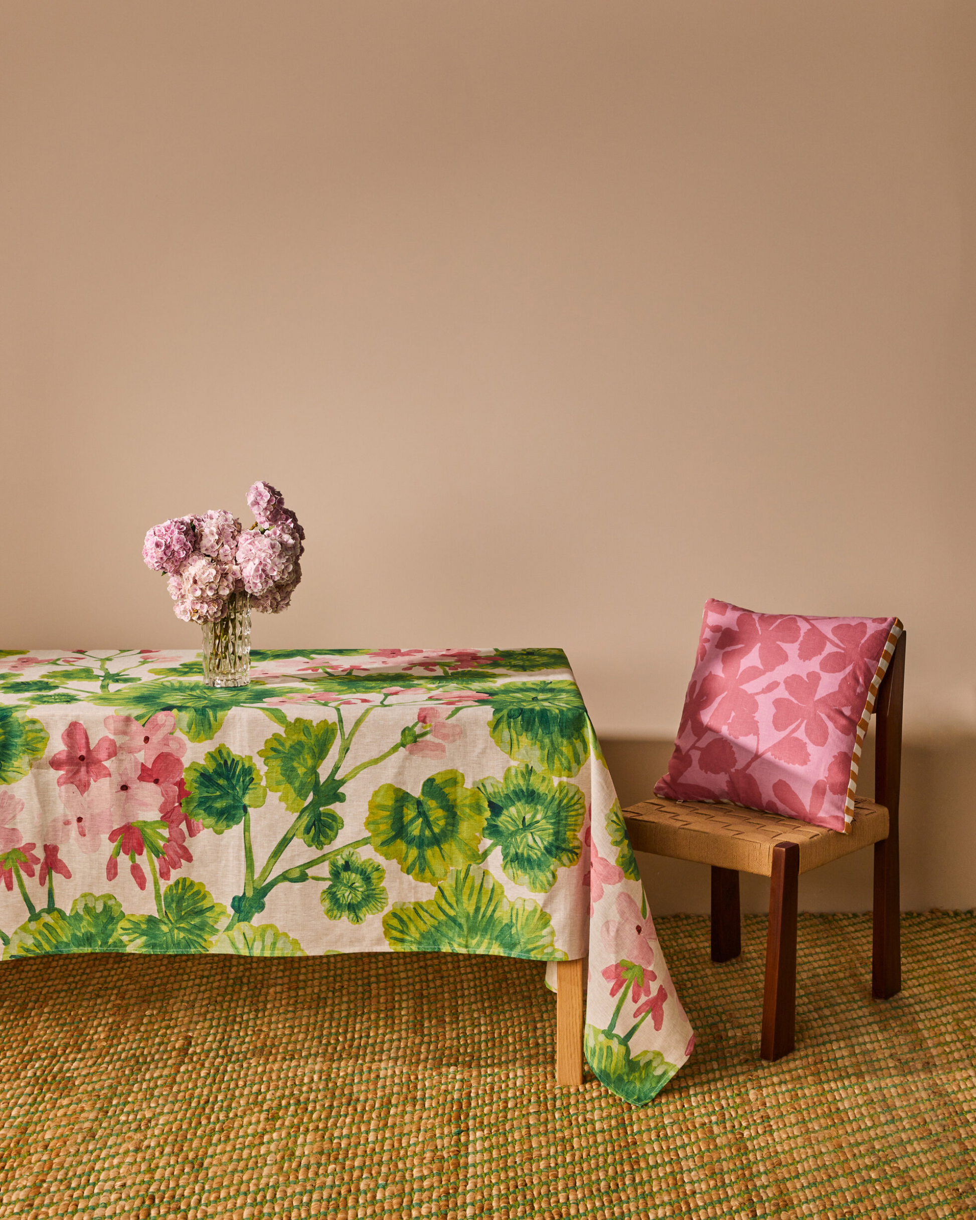 Wild and painterly, this linen tablecloth bursts with overgrown geranium flowers in sun-warmed pink and green. A garden-inspired design that turns every meal into a celebration.