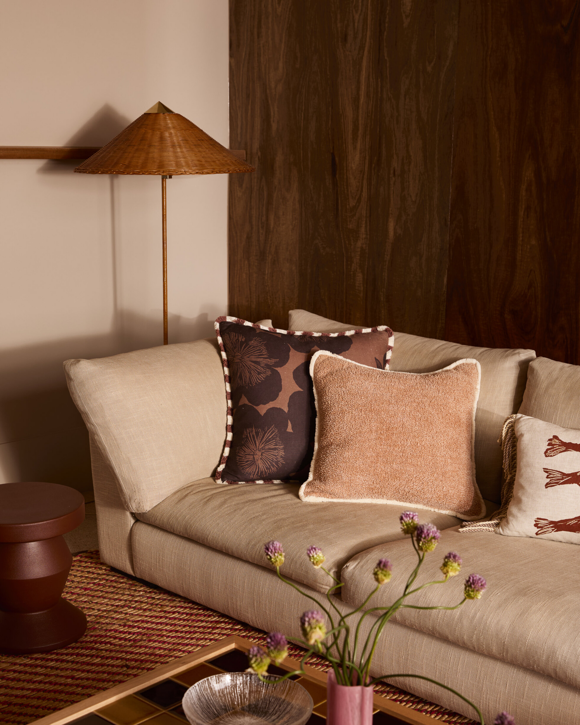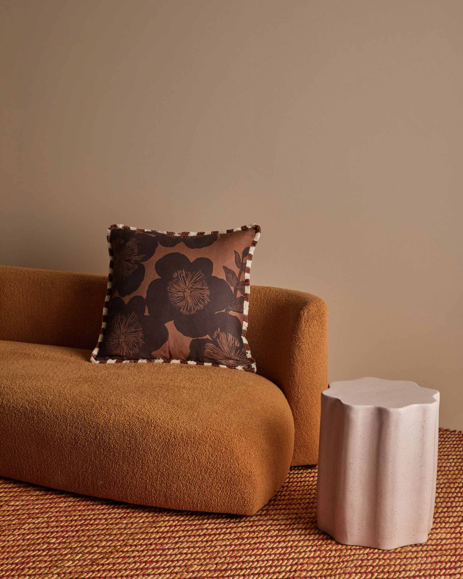 Earthy and rhythmic, this brown floral cushion highlights Jardin’s bold silhouettes in a deep, grounding tone. A refined choice for warm, tonal styling.