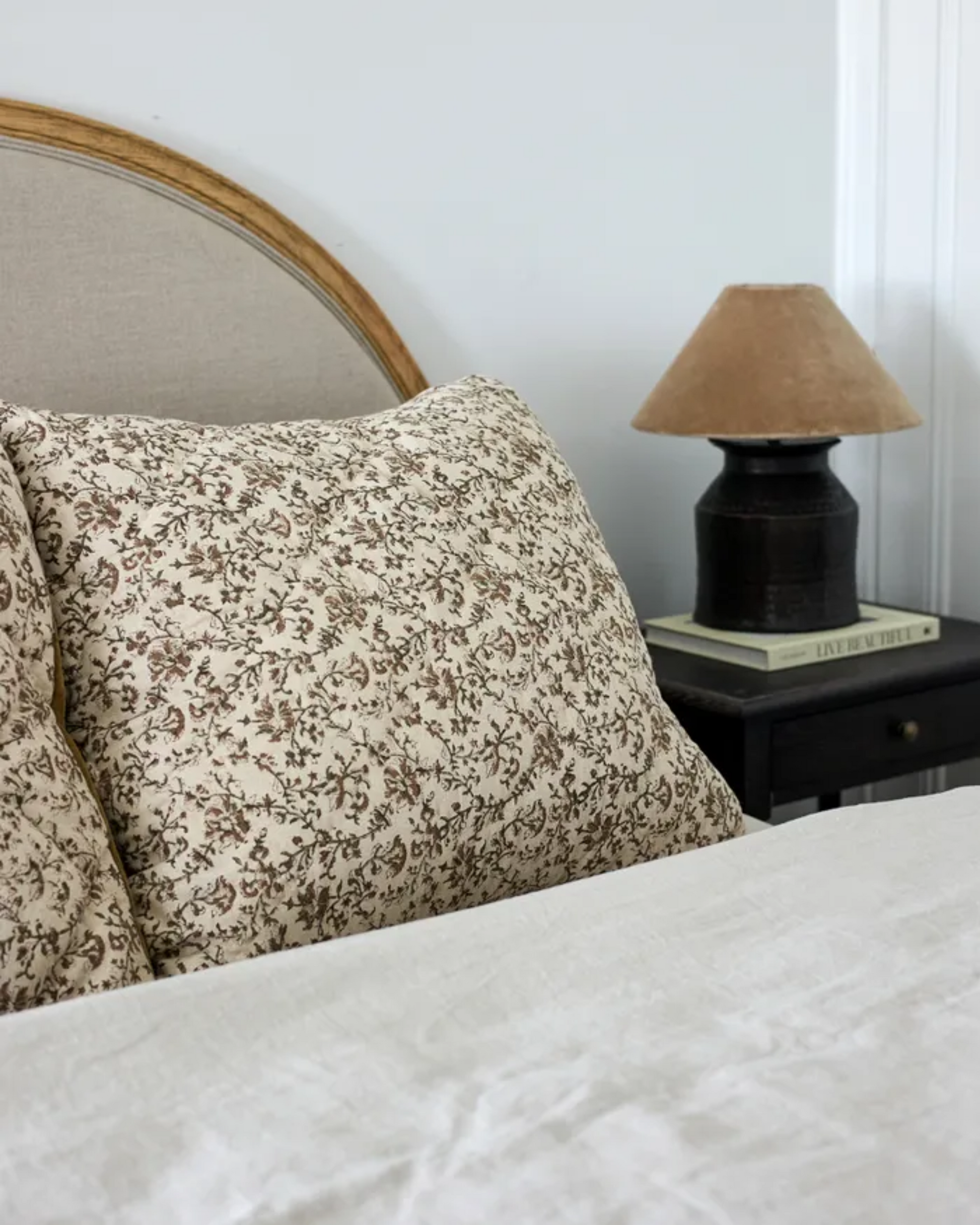 A reversible Euro cover that features an intricate hand block print on cotton linen fabric, that is backed with 100% cotton velvet, hand-quilted for a cozy, textured feel.