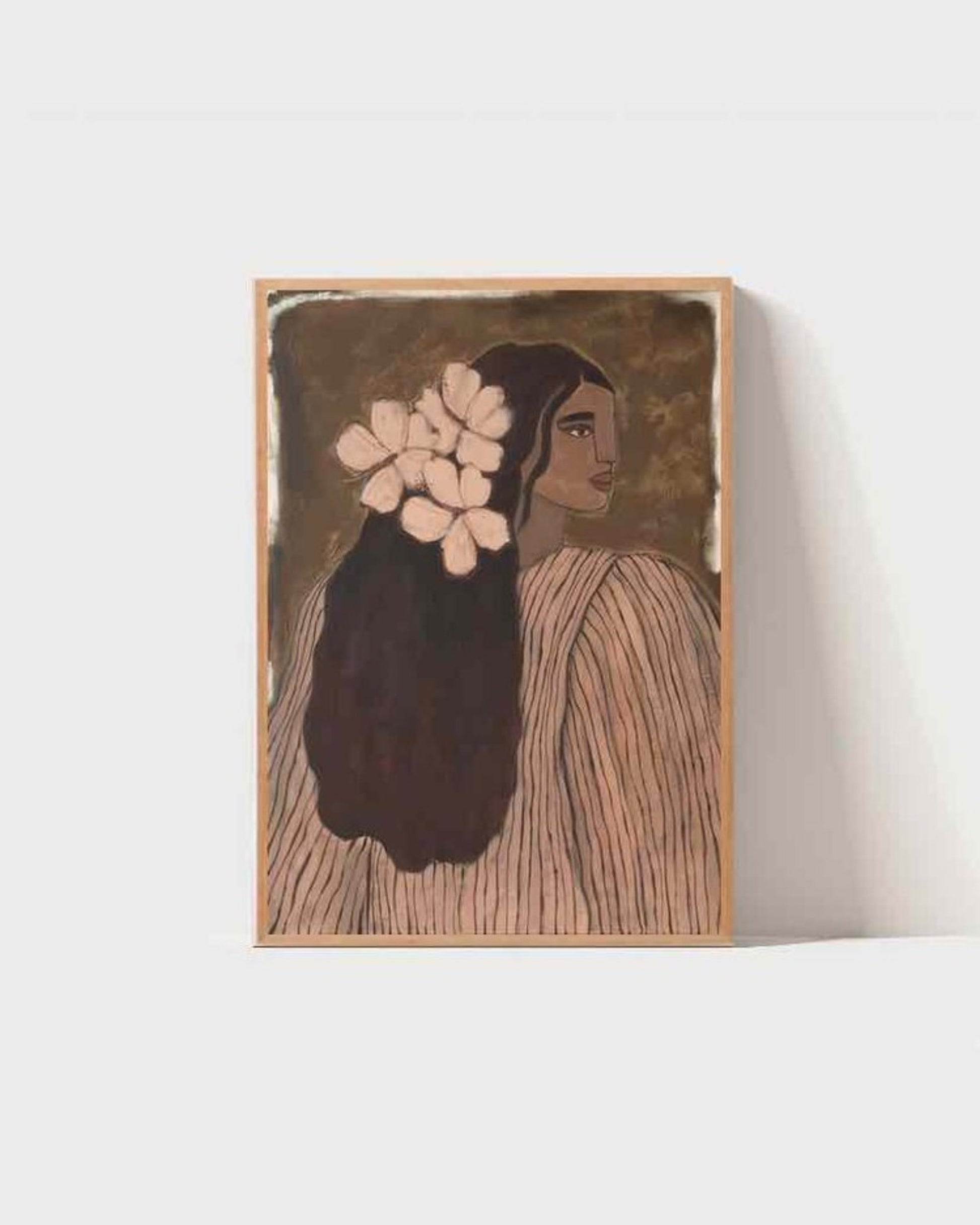 Limited edition locally made print in frame featuring a woman wearing a dusky pink striped blouse against a khaki textured background. Prints are professionally framed in raw oak (that naturally darkens overtime) and are cleanly taped on the back.