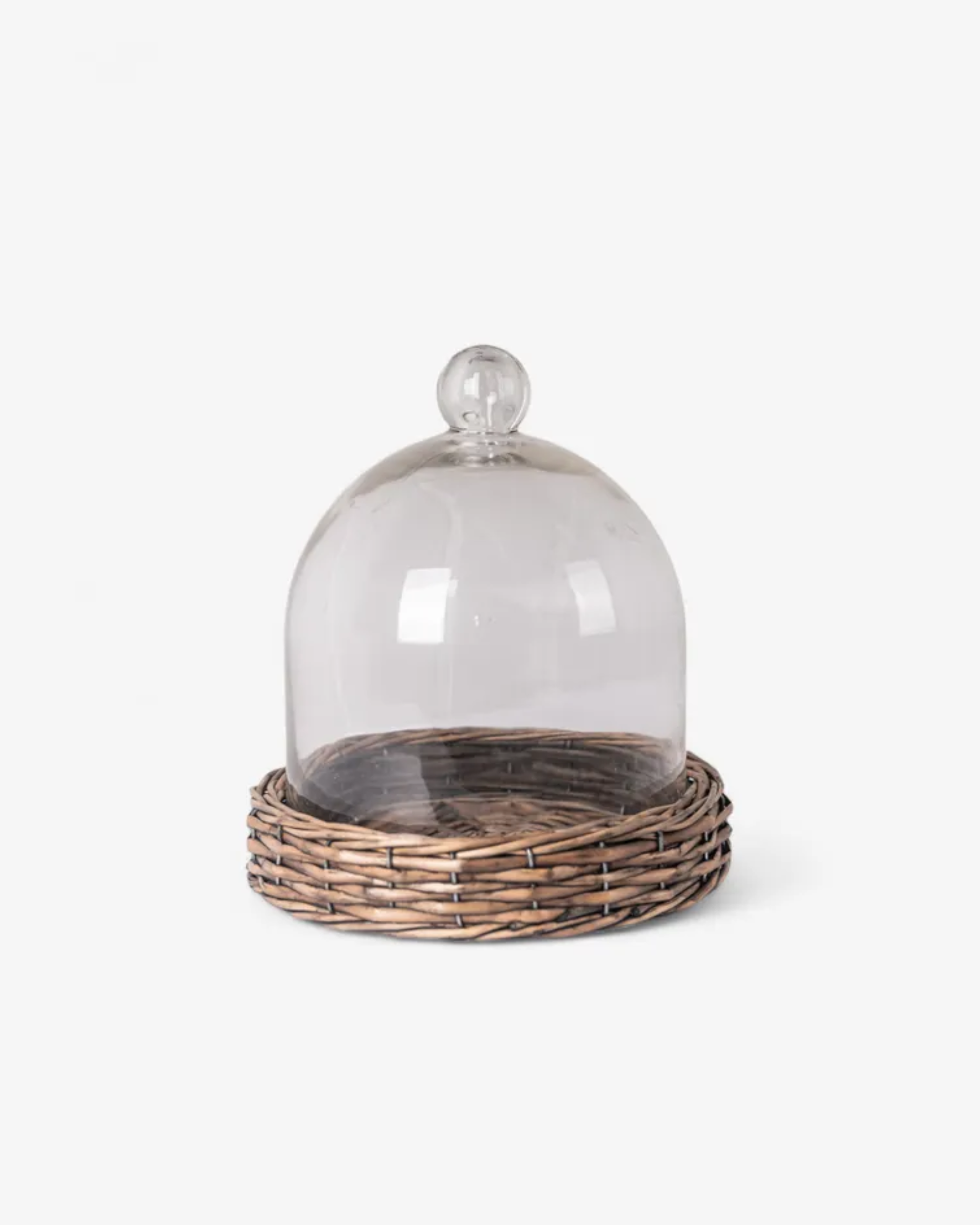 Bring a sense of rustic charm to your tablescape this Summer. This woven base with glass cloche is both decorative and practical. Use to decorate your shelves and then your table whilst covering food.