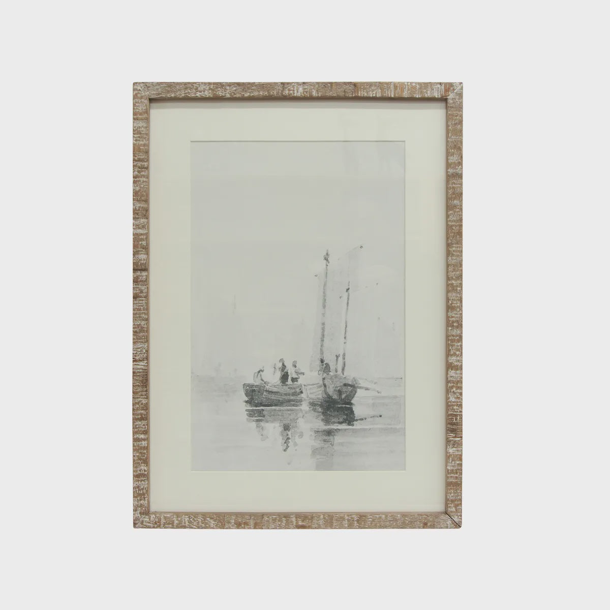 Serene sketched print of two sailing boats, mounted on ivory coloured card and encased in glass. Framed in a natural washed firwood frame.