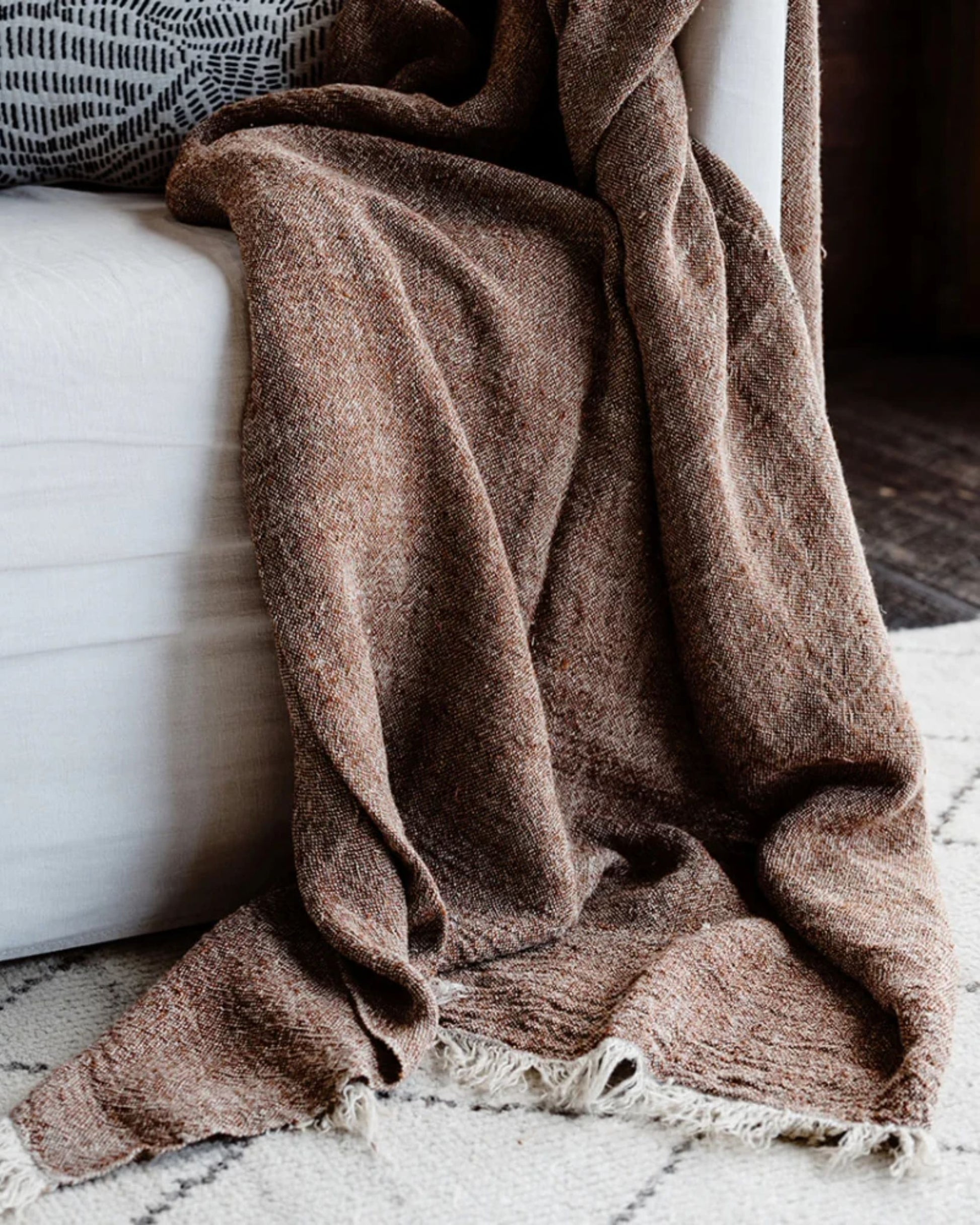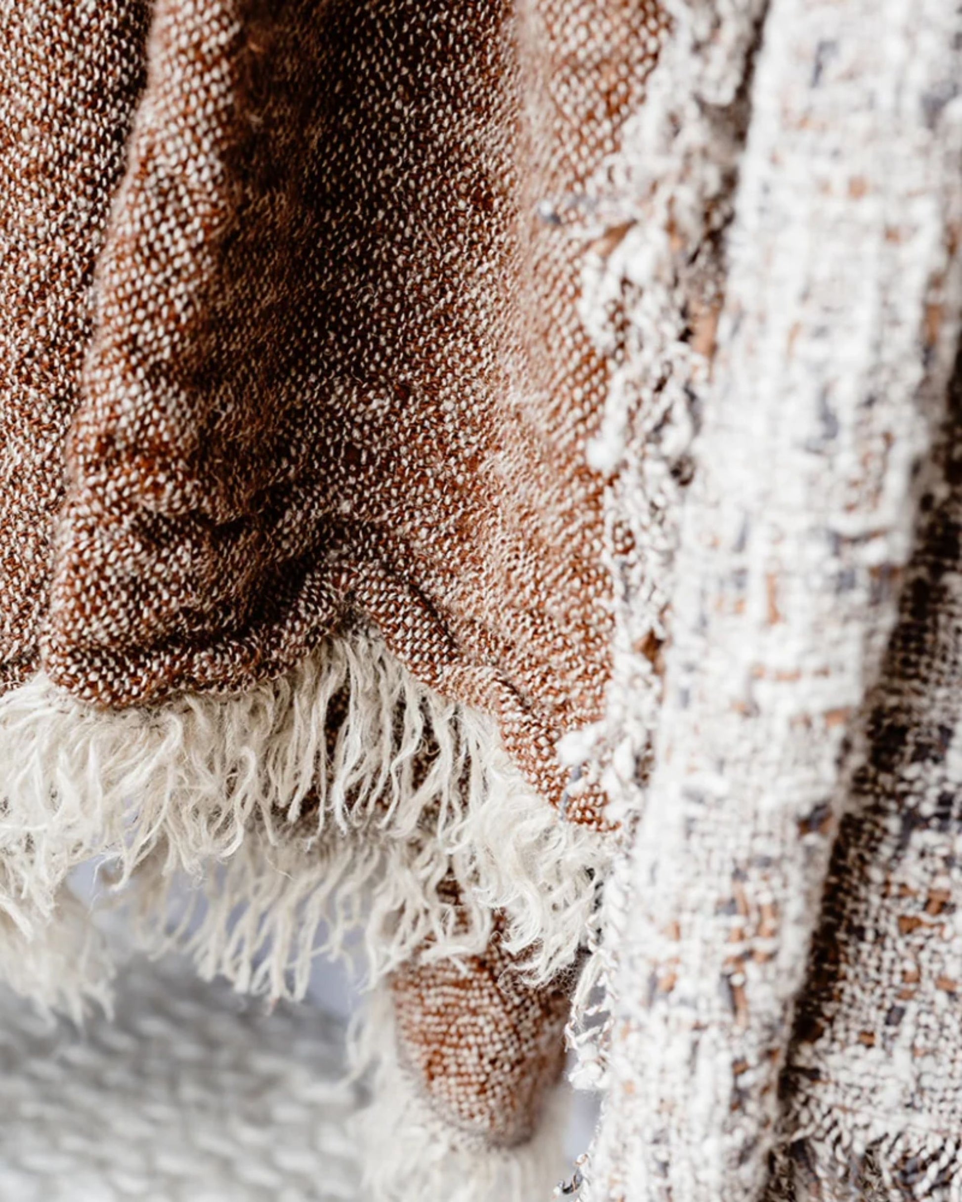 The Tabako Linen Throw exudes artisanal charm with its handwoven linen and rich, tobacco-toned base. Crafted on a traditional handloom and accented with natural fringing on the short sides, this cushion combines rustic elegance with a luxurious heavyweight feel.