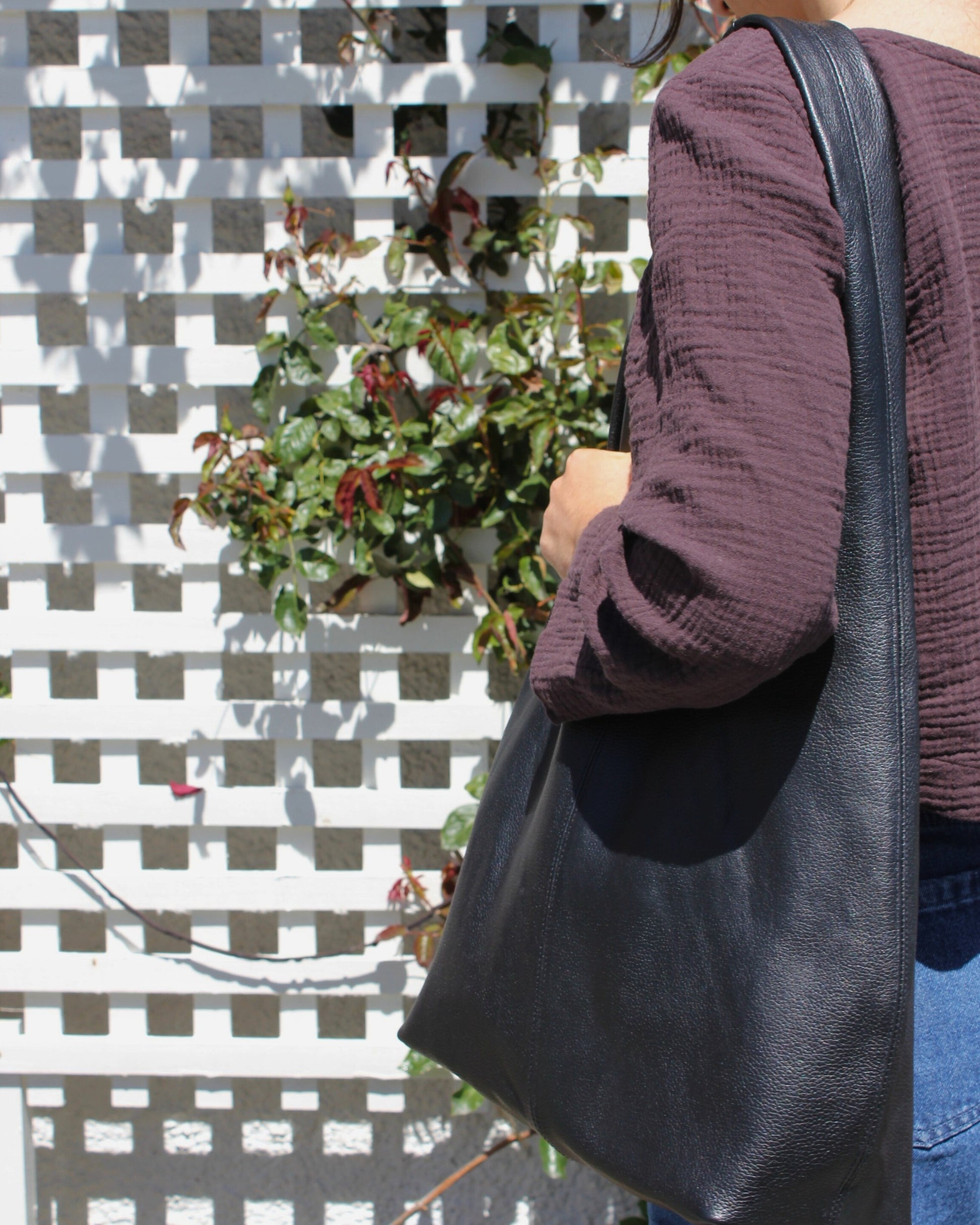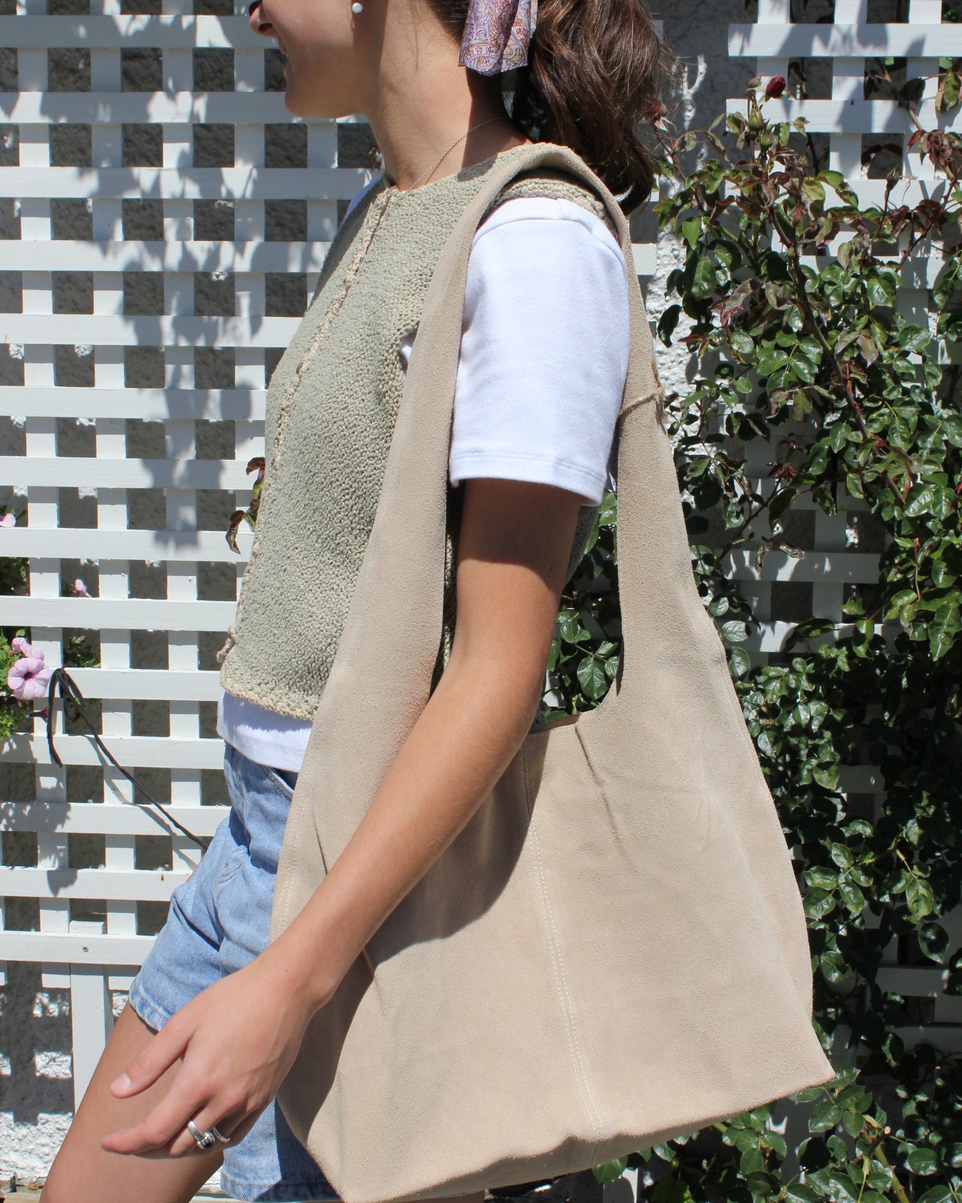 Elevate your style with our sophisticated leather slouch bag, meticulously crafted from premium suede and leather for lasting elegance. Its spacious interior and sleek design make it the perfect companion for both daily errands and professional settings, effortlessly blending practicality with luxury. Our bag features a magnetic closure at the top of the bag and a generous shoulder strap for your comfort, the ideal carryall that you can grab and go.