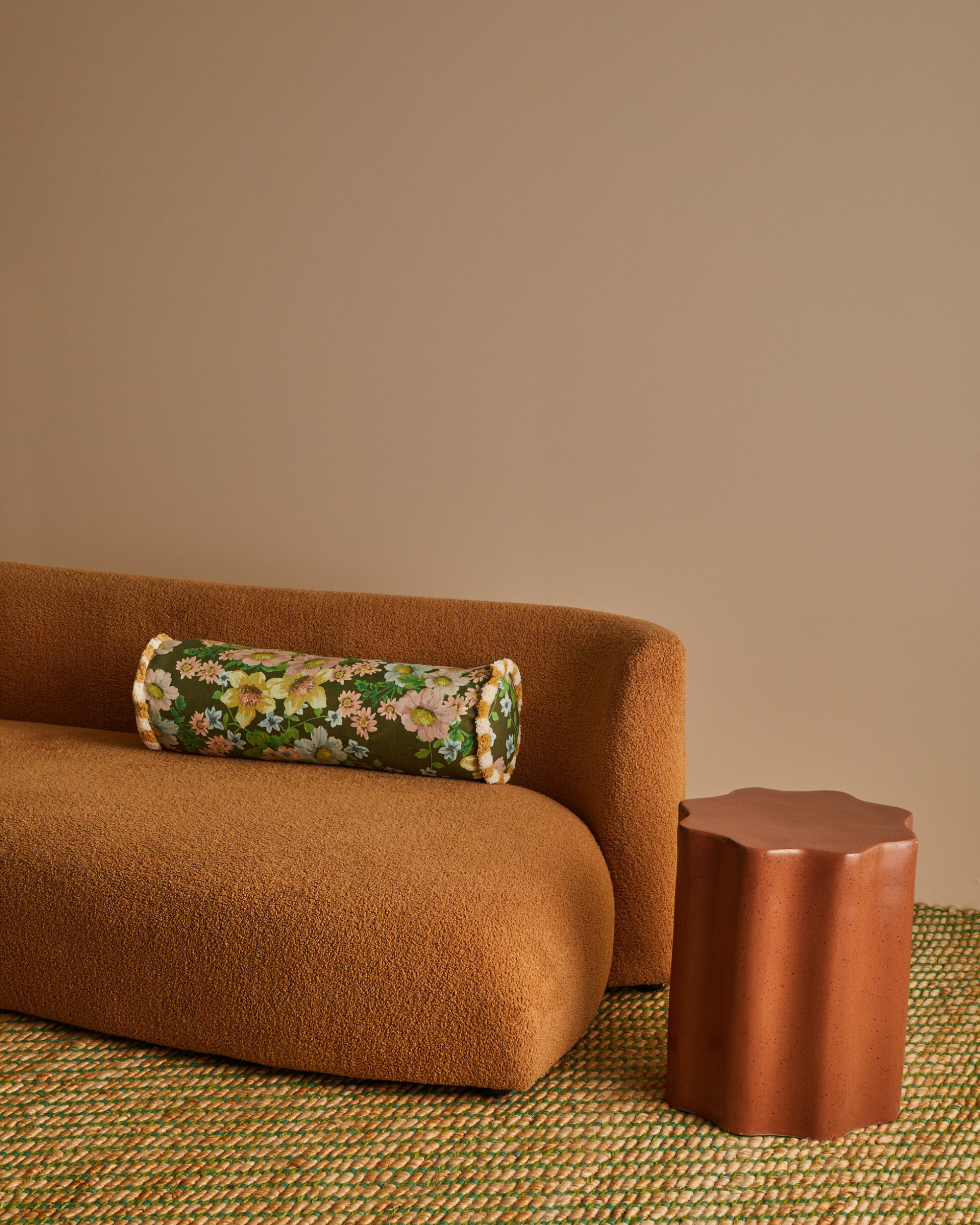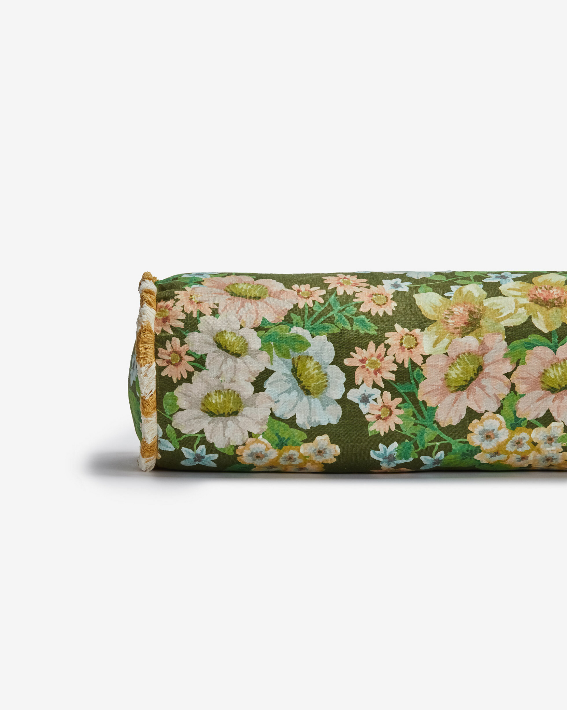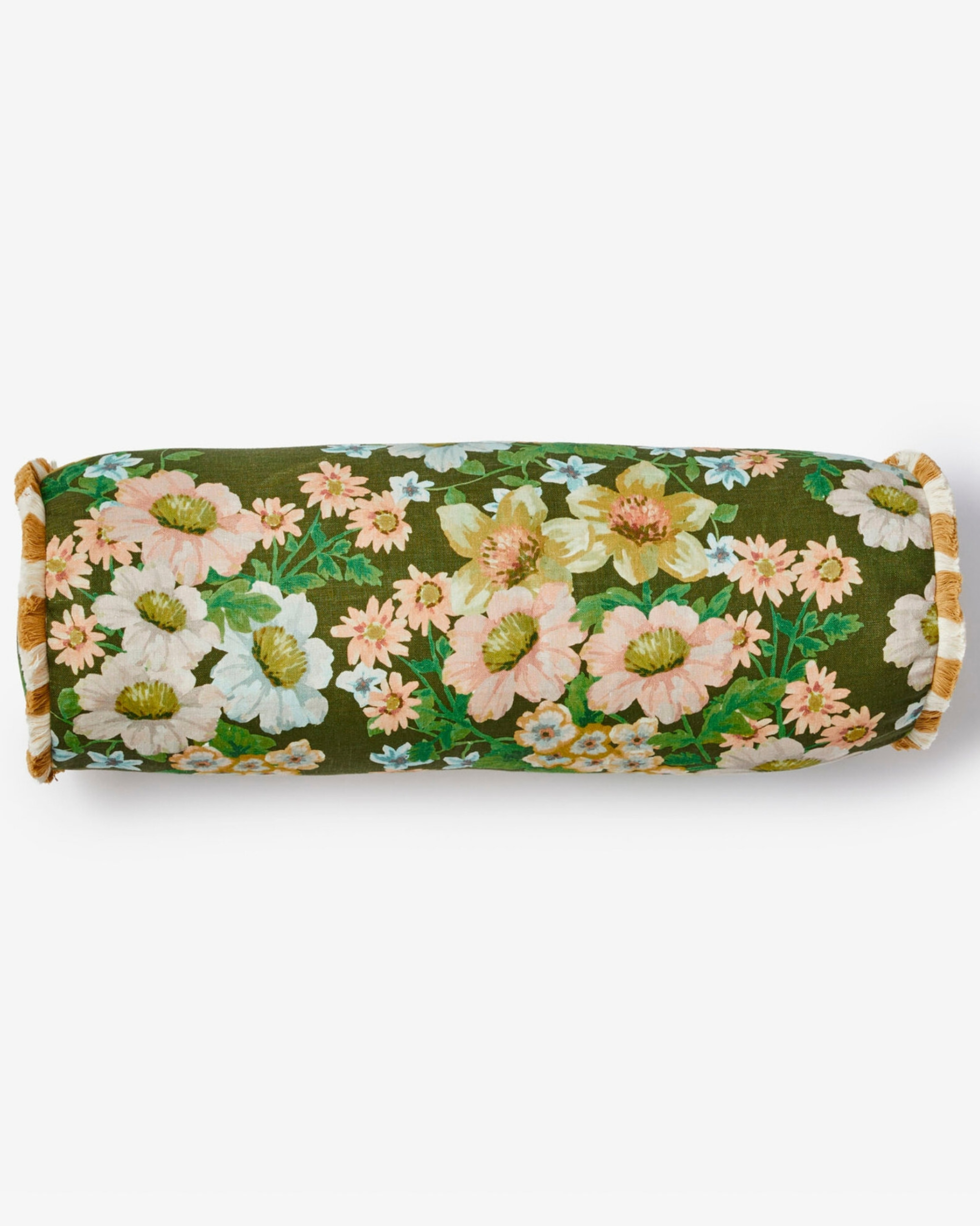 In olive green linen, this bolster cushion features the dainty floral forms of our Buttercup print. A refined, garden-inspired shape for beds or sofas.