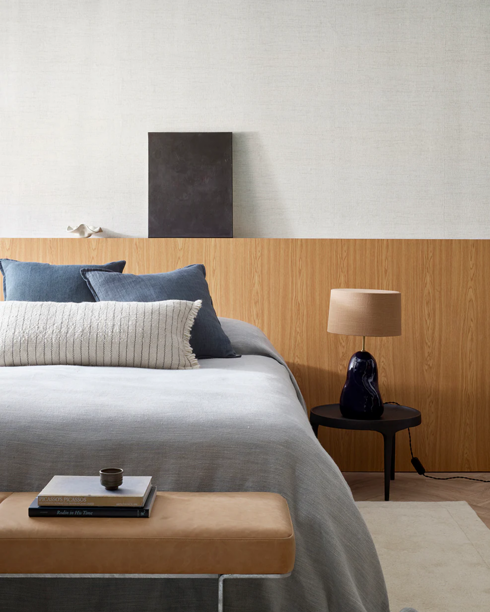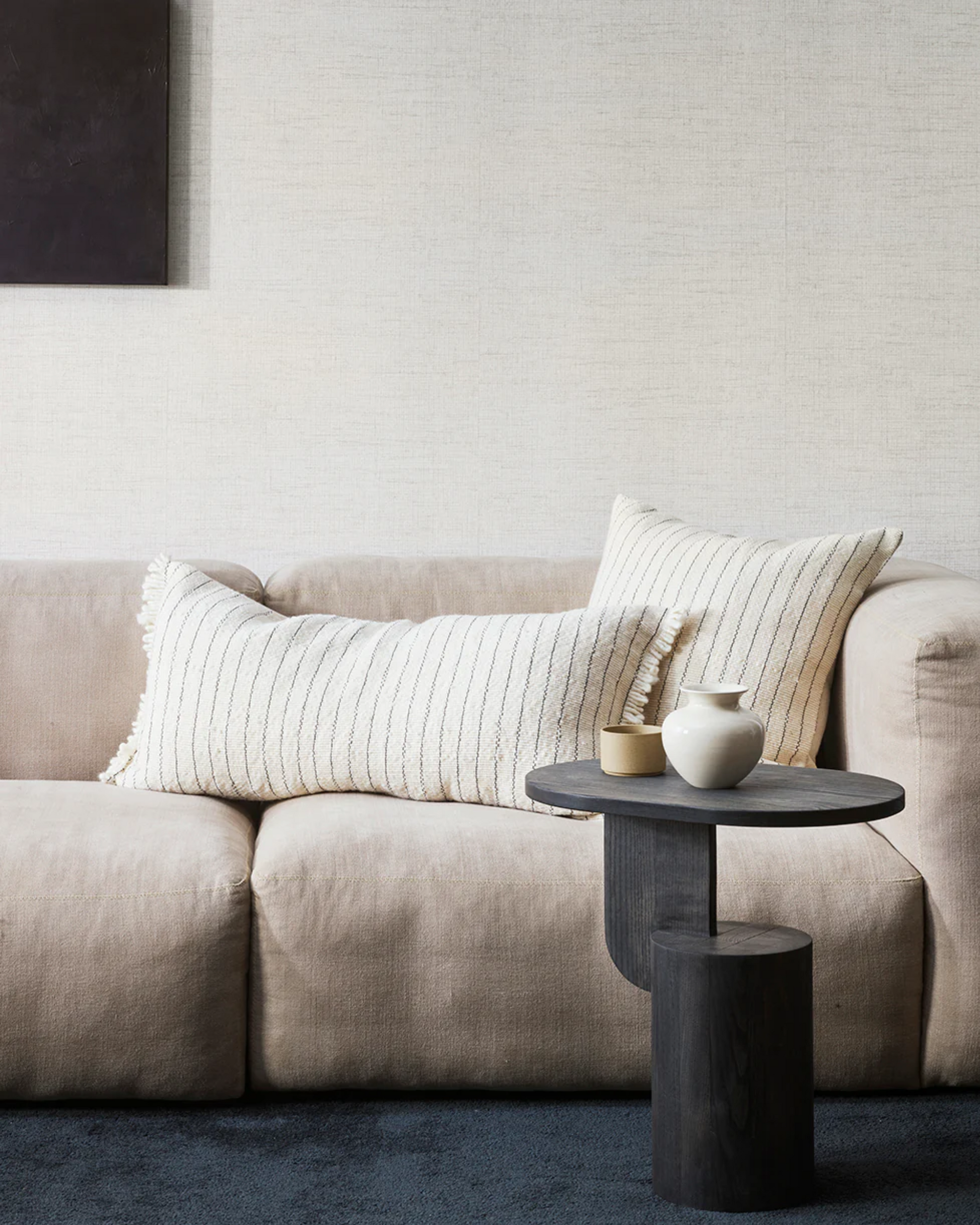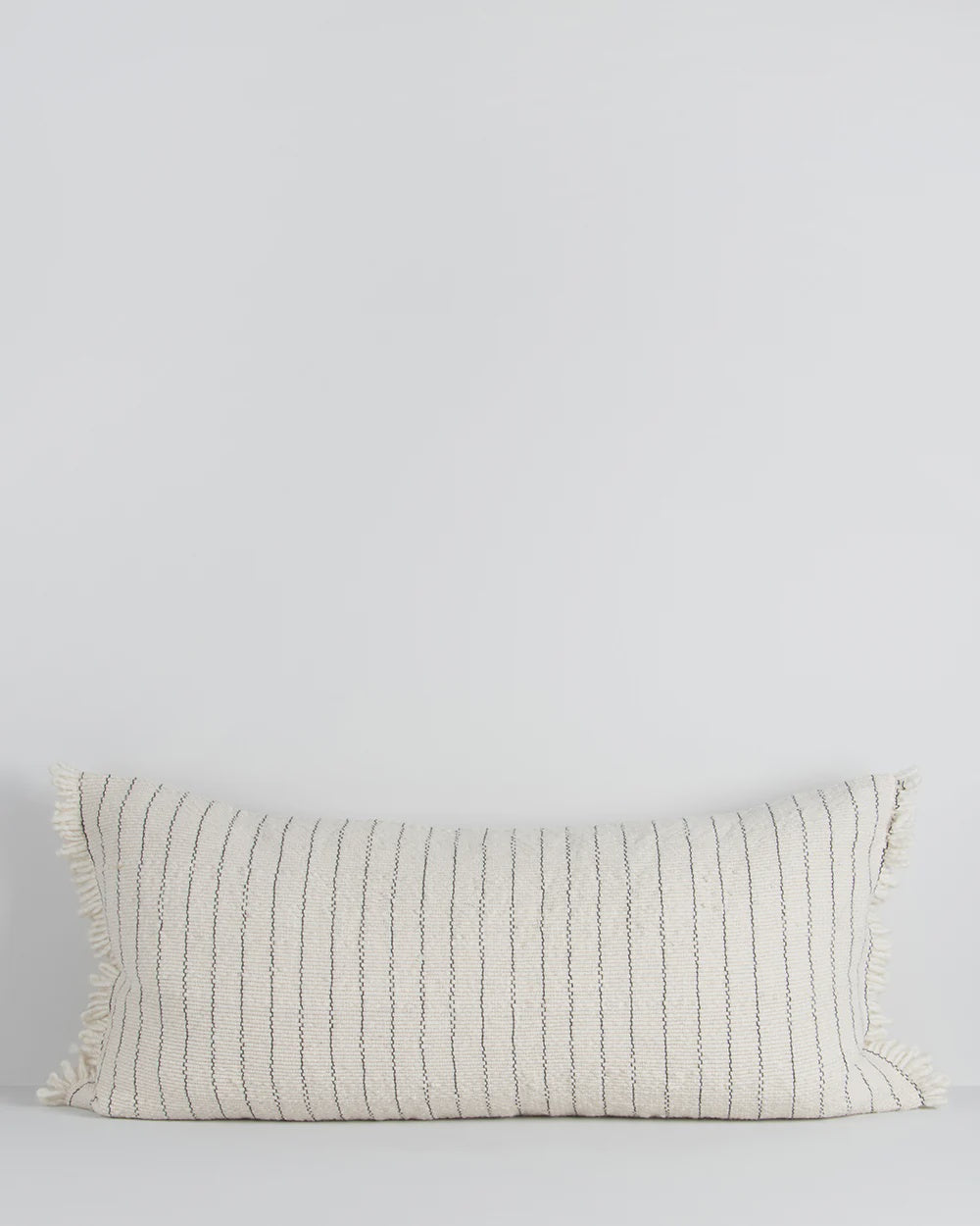Made from a luxurious blend of wool and cotton, the Niseko features soft woven fibres with navy linear detail and fringing at both ends. Crafted in a long lodge-style shape, the handmade nature of this piece adds warmth and tactility to bedroom and living spaces.