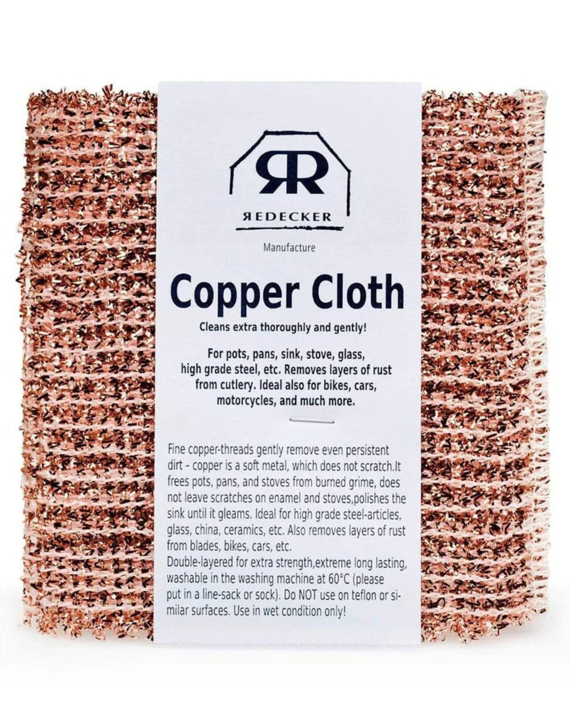 Fine copper threads gently remove persistent burned on cooking grime. This set of two handy cloths has been designed so as to not leave scratches on enamel and stoves. The copper fibre also has the added benefit of polishing sinks, pans, ovens, ceramic cook tops, glass and stainless steel basins as it cleans.