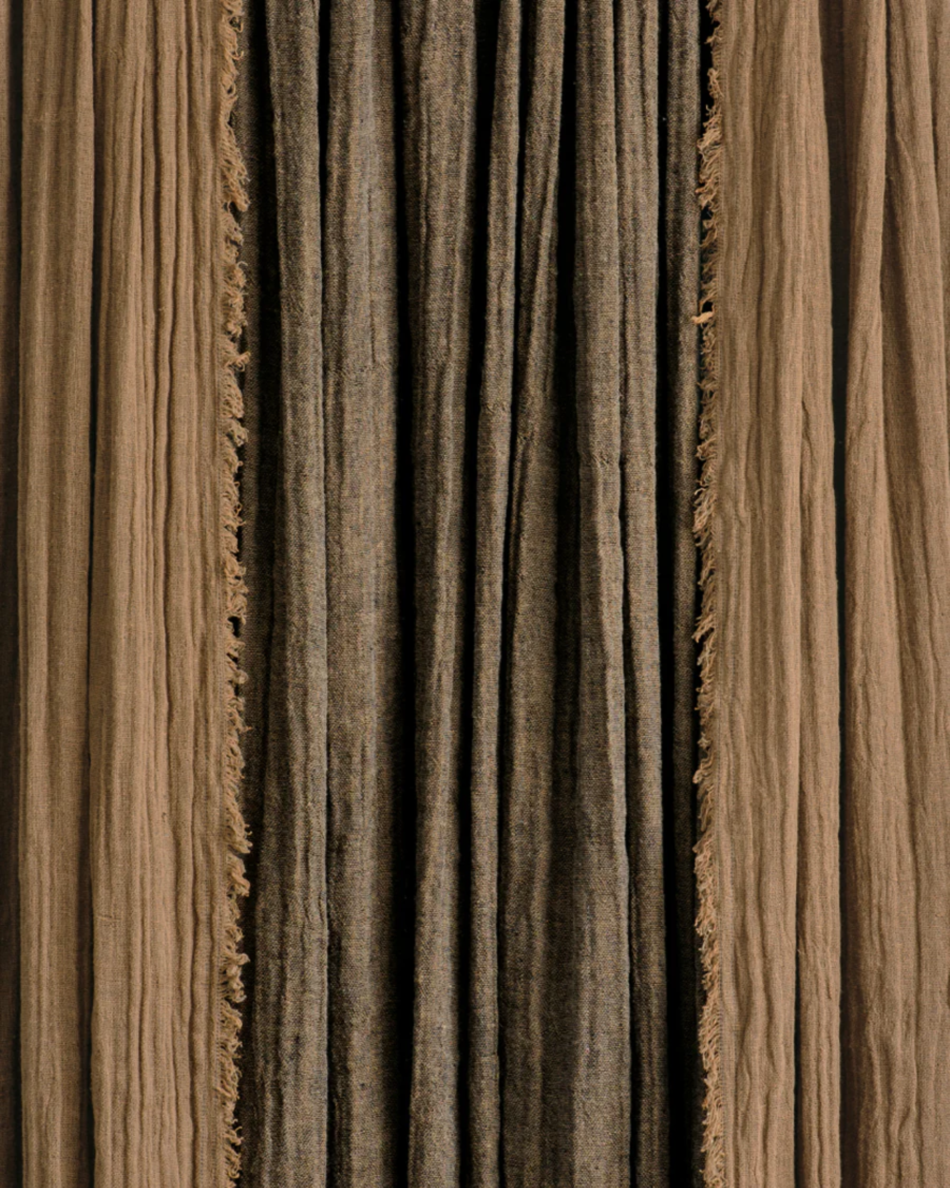 The ultimate lightweight blanket for balmy summer nights, Leggera is a double-layered, floaty gauze fabric made from a mix of linen and cotton. The crinkled, soft-washed finish with frayed edges brings a casual, relaxed aesthetic to any room. Alternatively if ironed smooth can provide a more tailored look. This generous blanket is reversible with a bronze top and a cedar underside.