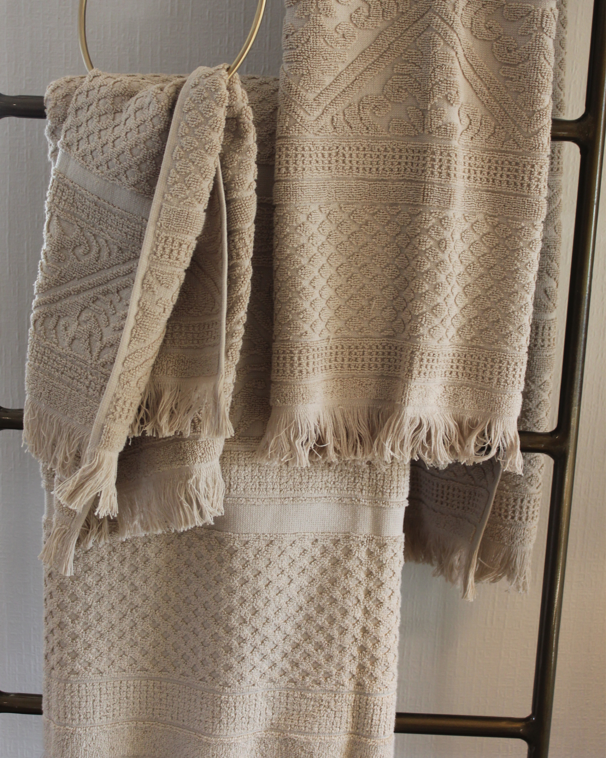 Enhance your bathroom with the Zoe Guest Towel from French textile brand Vivaraise. Crafted from 100% cotton, this soft and absorbent towel features a classic jacquard weave and a fringed edge for a touch of elegance.