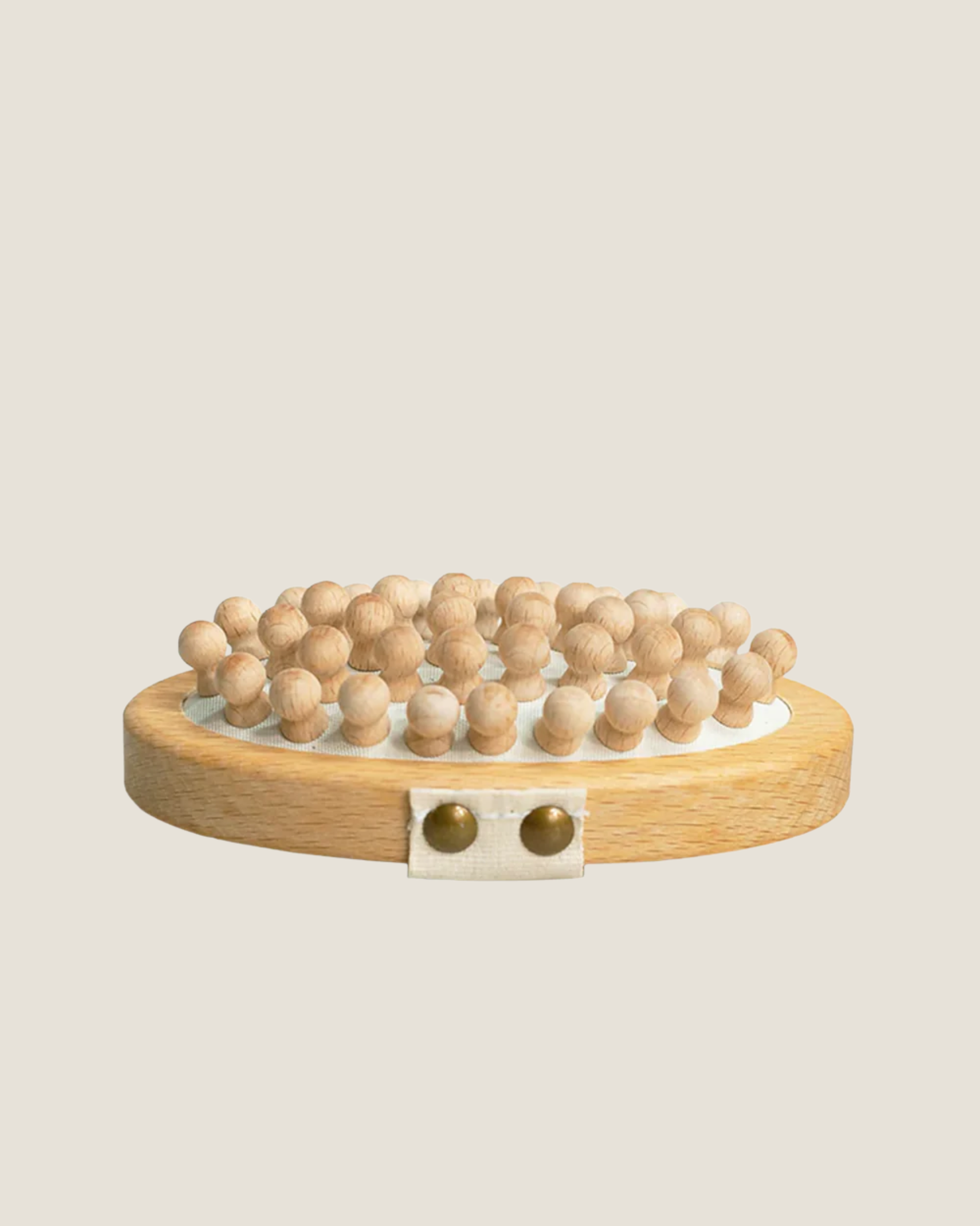 Redecker's waxed beech wood Anti Cellulite Massage Brush features wood pins and a cotton belt designed for spot treatment of cellulite. The firm pins massage the affected area increasing blood circulation, oxygen and nutrients while loosening toxins and fat deposits of cellulite. After use rinse gently in tepid water after use, dry at room temperature. Store in a dry area away from moisture.