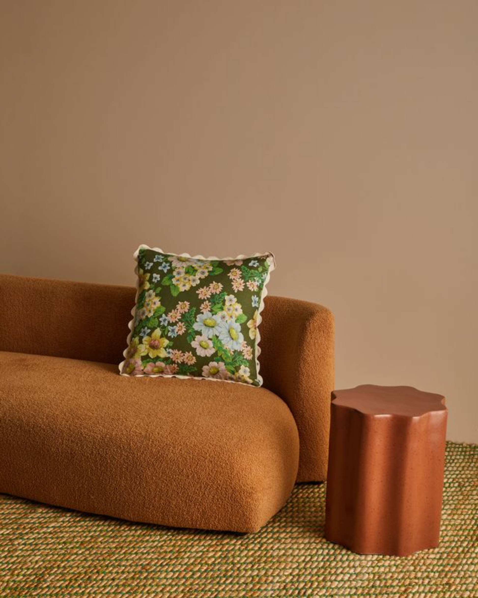 A rich olive green linen cushion featuring the delicate floral motifs of our Buttercup print. A grounding, garden-inspired layer that pairs beautifully with warm or neutral tones.